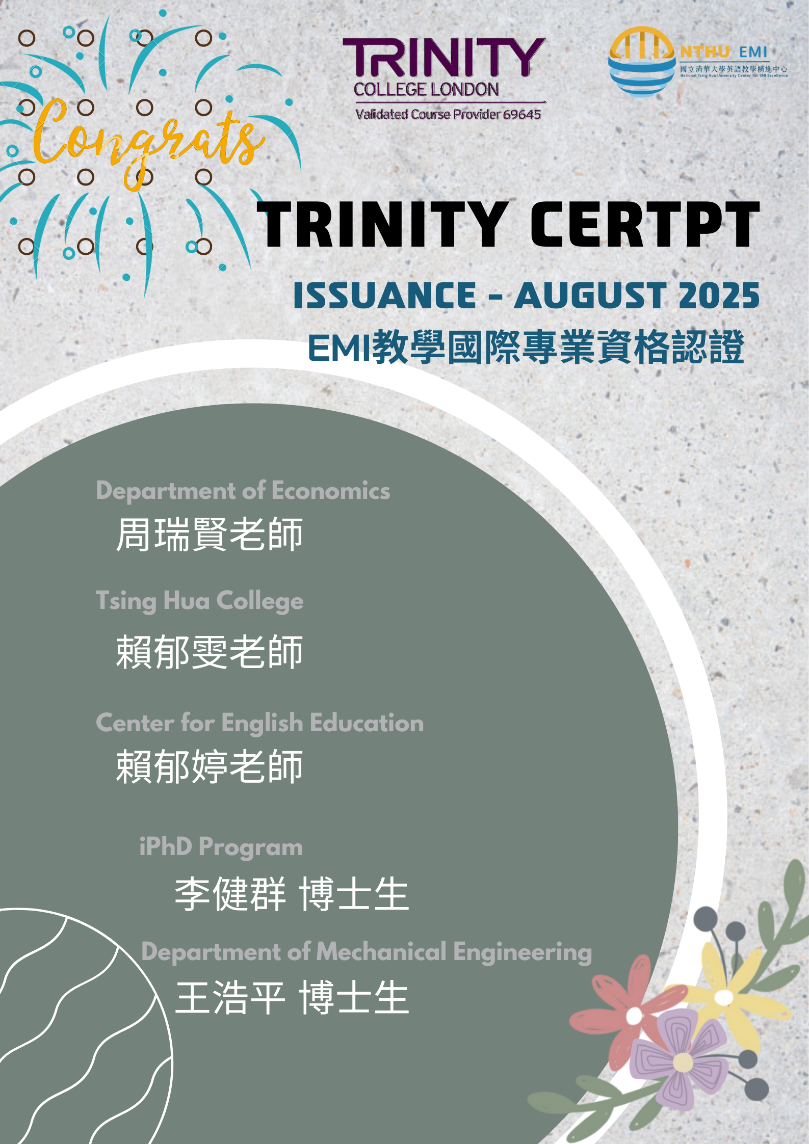 【恭賀】EMI教學國際專業資格認證 Trinity CertPT Issuance - August 2025 名單