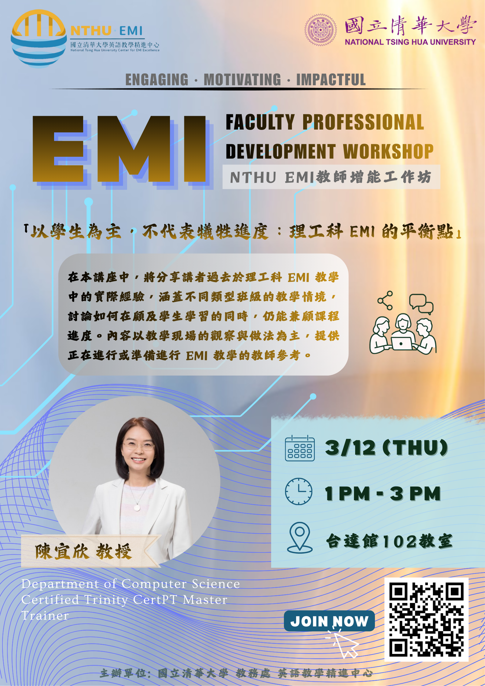 【3/12 EMI教師增能工作坊_資工系陳宜欣教授主講】3/10前報名 - NTHU EMI Faculty PD Workshop scheduled on 3/12